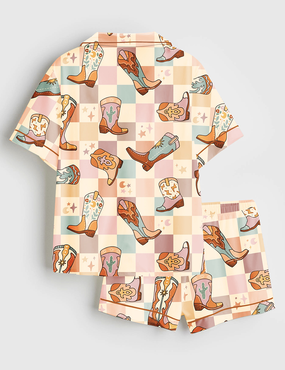 Women’s Colorful Plaid Western Cowboy Boot Short Sleeve Satin Pajama Set