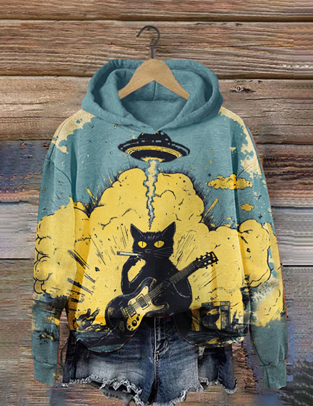 Women's Black Cat Smoking Guitar Explosion Art Print Hoodie